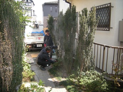 越境樹木の伐採 ご事情で5年間ほど手を入れられていなかったお庭のお手入れを承りました。 すべてを地面の高さでカットということではなかったので、植木職人も含めて作業いたしました。 まずは越境している樹木から対応いたしました。